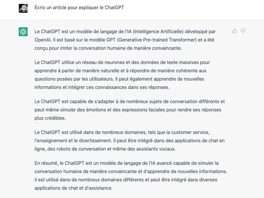 Vous êtes probablement nombreux à vous demander de quoi on parle dans cet article. Concrètement, le ChatGPT est une intelligence artificielle qui répond à toute sorte de questions. Lancé en phase de test pour le moment, le site a déjà enregistré plus d’un million d’inscriptions. Pour vous faire une idée concrète, on a posé une question au ChatGPT. En lui demandant de rédiger un article sur le ChatGPT :